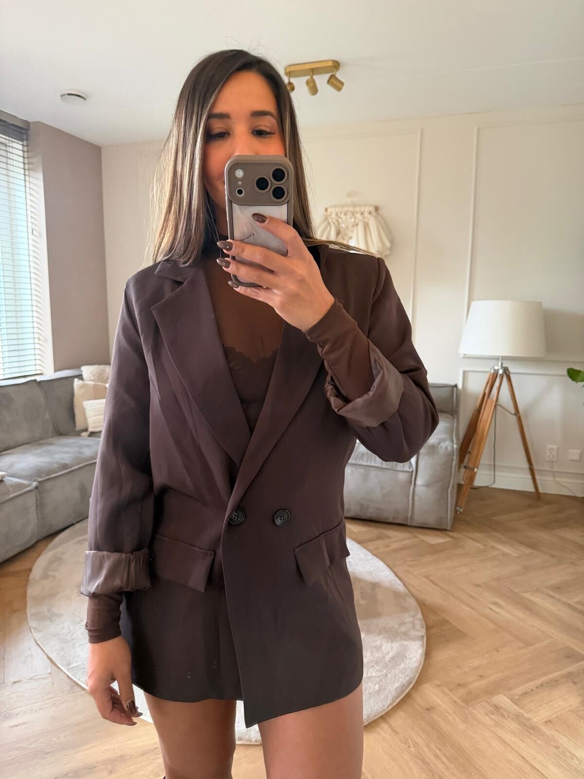 - Deze chique bruine blazer is dé perfecte mix tussen classy en nonchalant. Dankzij de oversized fit en soepele stof valt hij prachtig om het lichaam — ideaal om zowel casual als dressed-up te dragen. Combineer met een kanten top of draag ‘m solo als statement piece.